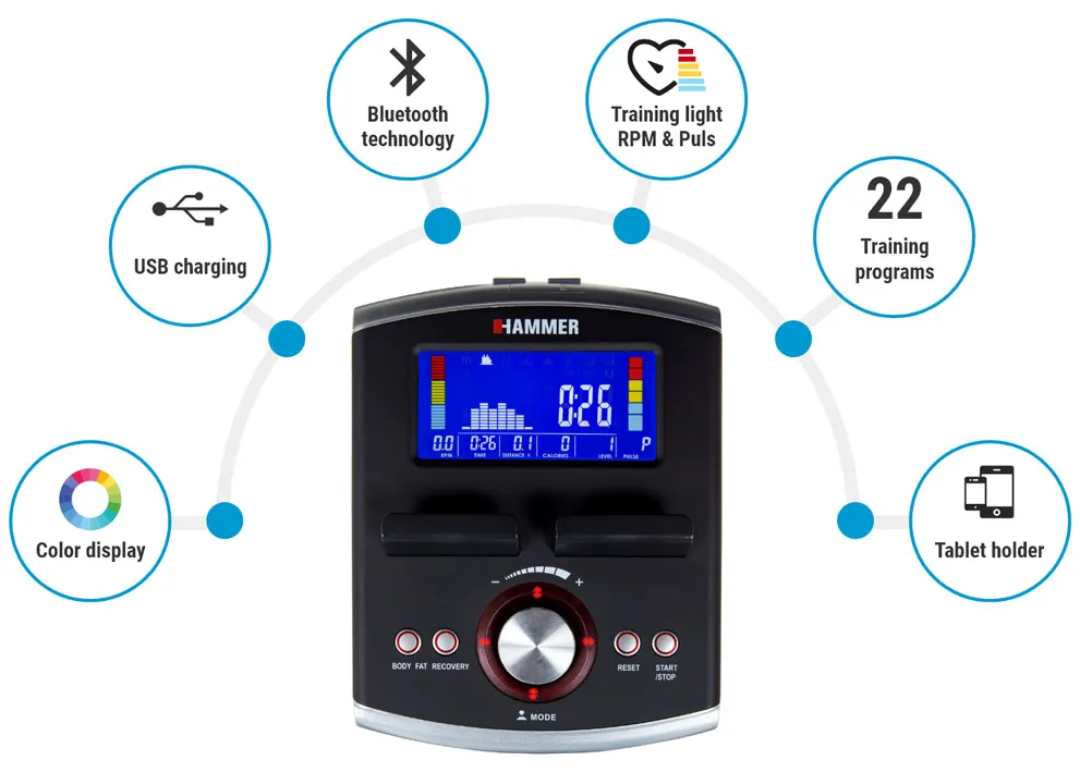 Paljudel elliptilistel trenažööridel on olemas ka mitmeid lisasid, nagu pudelihoidja, tahvelarvutihoidja. Üha enam elliptilisi trenažööre pakuvad Bluetooth-ühendust, mis võimaldab ühendada telefoni või tahvelarvuti (ka iPhone või iPad) juhtmevabalt elliptilise trenažööriga. See võimaldab paigutada telefoni jalgrattakonsoolile ja kasutada seda puutekonsoolina. Nii näed oma pedaalimiskiirust otse nutitelefonis või tahvelarvutis ja saad nutitelefonis juhtida pedaalimise raskustaset! Erinevad mobiilirakendused võimaldavad jälgida kardio- ja HIIT-treeninguid, kohandada treeningrutiine ja jälgida oma statistikat, näiteks põletatud kalorite arvu. Bluetooth-ühendus on pluss, mis muudab treeningu interaktiivsemaks.