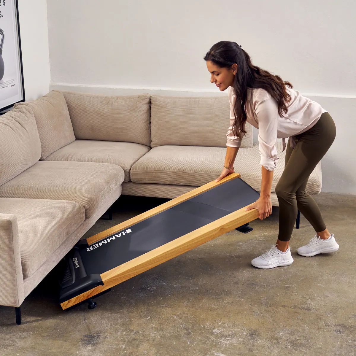 The Hammer Walk 2.0 NorsK combines stylish oak with smart functionality. With its compact design and whisper-quiet motor, the walker is ideal for home offices, living rooms and offices. Walking improves circulation, helps concentration and is a good change from sitting. Innovative cushioning technology and an ultra-quiet motor ensure a peaceful and pleasant experience. It allows you to stay active, even at home or in shared offices, without disturbing conversations, concentration or your loved ones. Two incline angles allow for a versatile workout. A modern display shows you important data like time, speed, distance and calories, and you can control all functions with the remote.