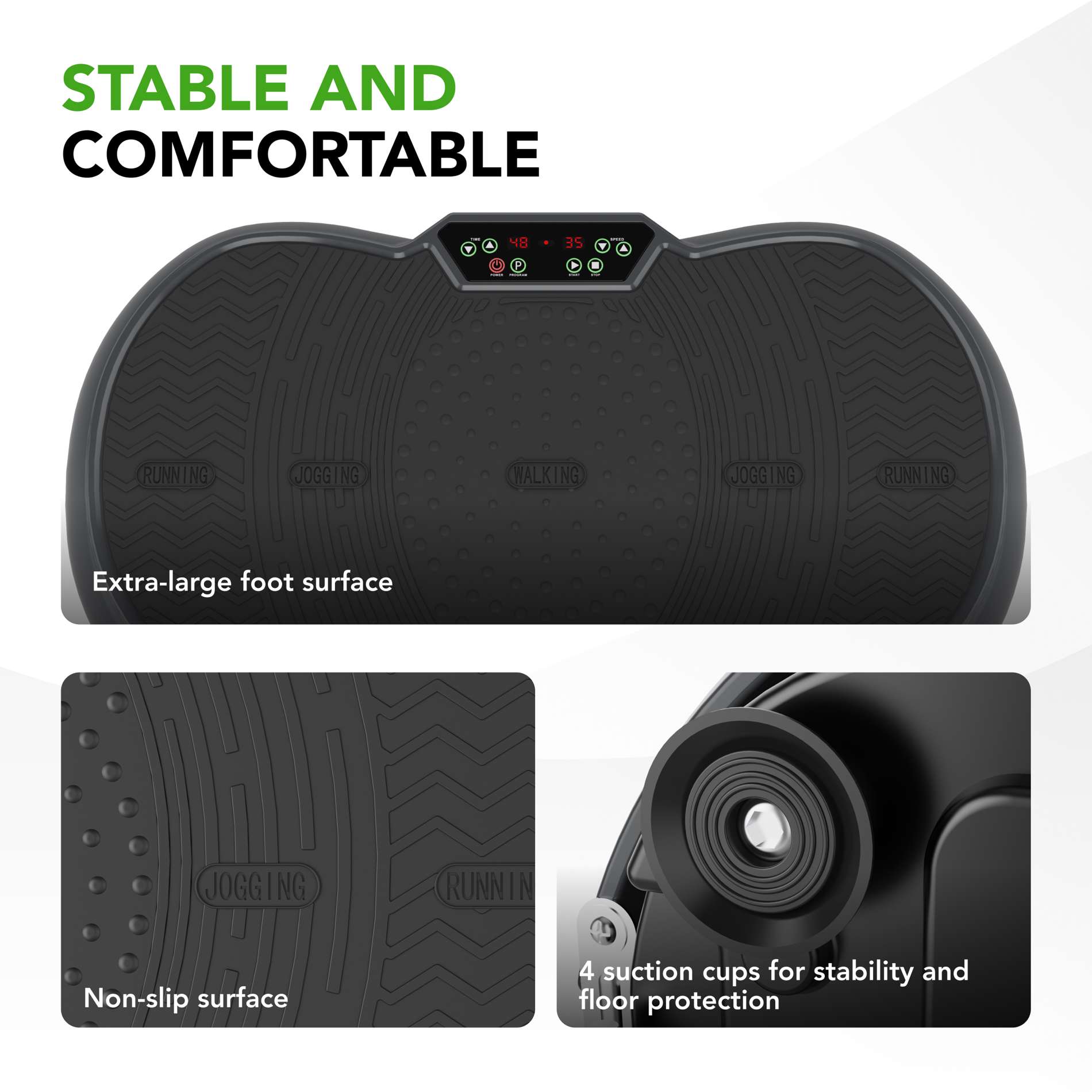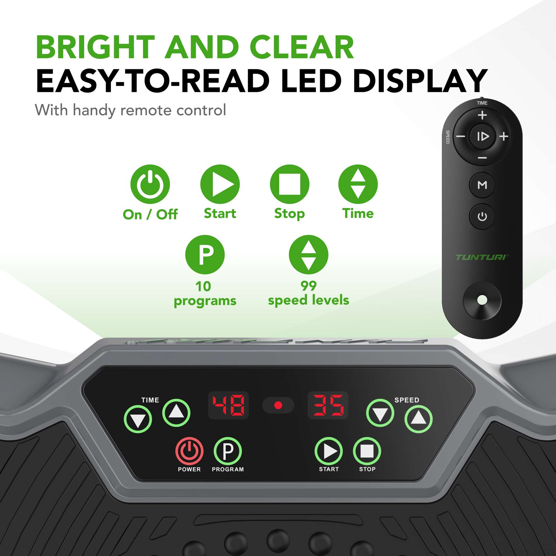 Vibratsiooniplaadil Tunturi Cardio Fit Vibration Plate on mitmeid eeliseid – need on head rasvapõletuseks ja lihaste ehitamiseks ning lisaks parandavad ka luude tihendust ning vereringet. See kompaktne vibratsiooniplaat mahub iga diivani alla ning pakub 99 erinevat kiirust ja 10 programmi efektiivseks treeninguks. Võimas 200W mootor toodab ostsilleerivaid vibratsioone, mis aktiveerivad lihased, stimuleerivad vereringet ning parandavad tasakaalu. Komplekti kuuluvad venituskummid ning juhtmevaba pult pakuvad vaheldust ning mugavust. Venituskummidega saate treenida oma käsi, õlgu ning kerelihaseid plaadi peal seistes. Puldiga saate reguleerida kiirust ning vahetada programme ilma plaadilt maha astumata.
